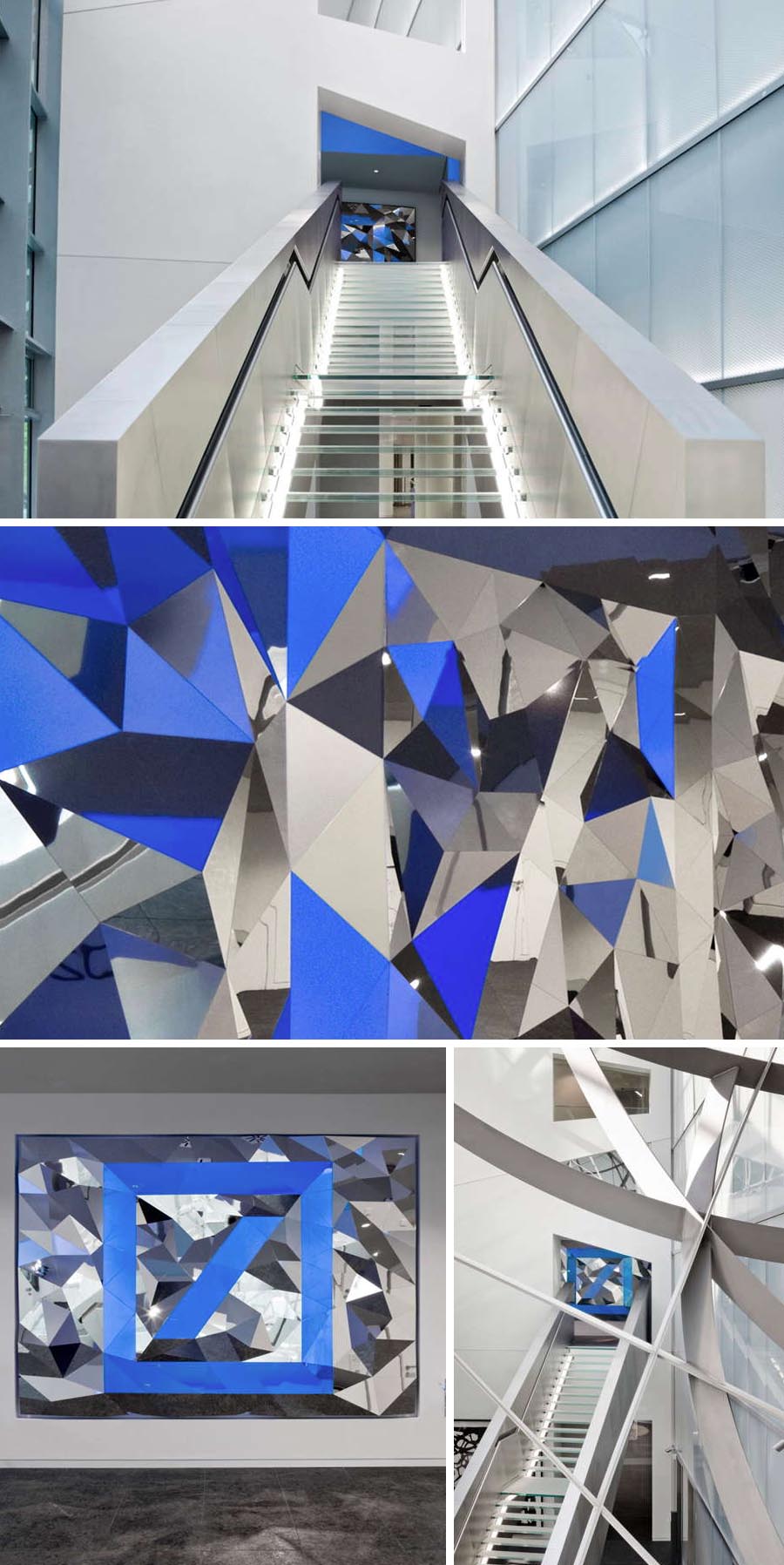 Berlin-based interdisciplinary design studio ART+COM was asked by Deutsche Bank to create an installation for a vestibule near the conference room in the company’s headquarters. The brief stated the inclusion of the bank’s iconic logo (designed by Anton Stankowski) in the work. In order to avoid a huge logo dominating the small 25 square foot space, ART+COM opted for a less obtrusive and more poetic approach: anamorphosis. As the visitor climbs the staircase, the abstract mirrored sculpture slowly reveals the logo, but it’s not until the top of the stairs are reached that the image is fully resolved.