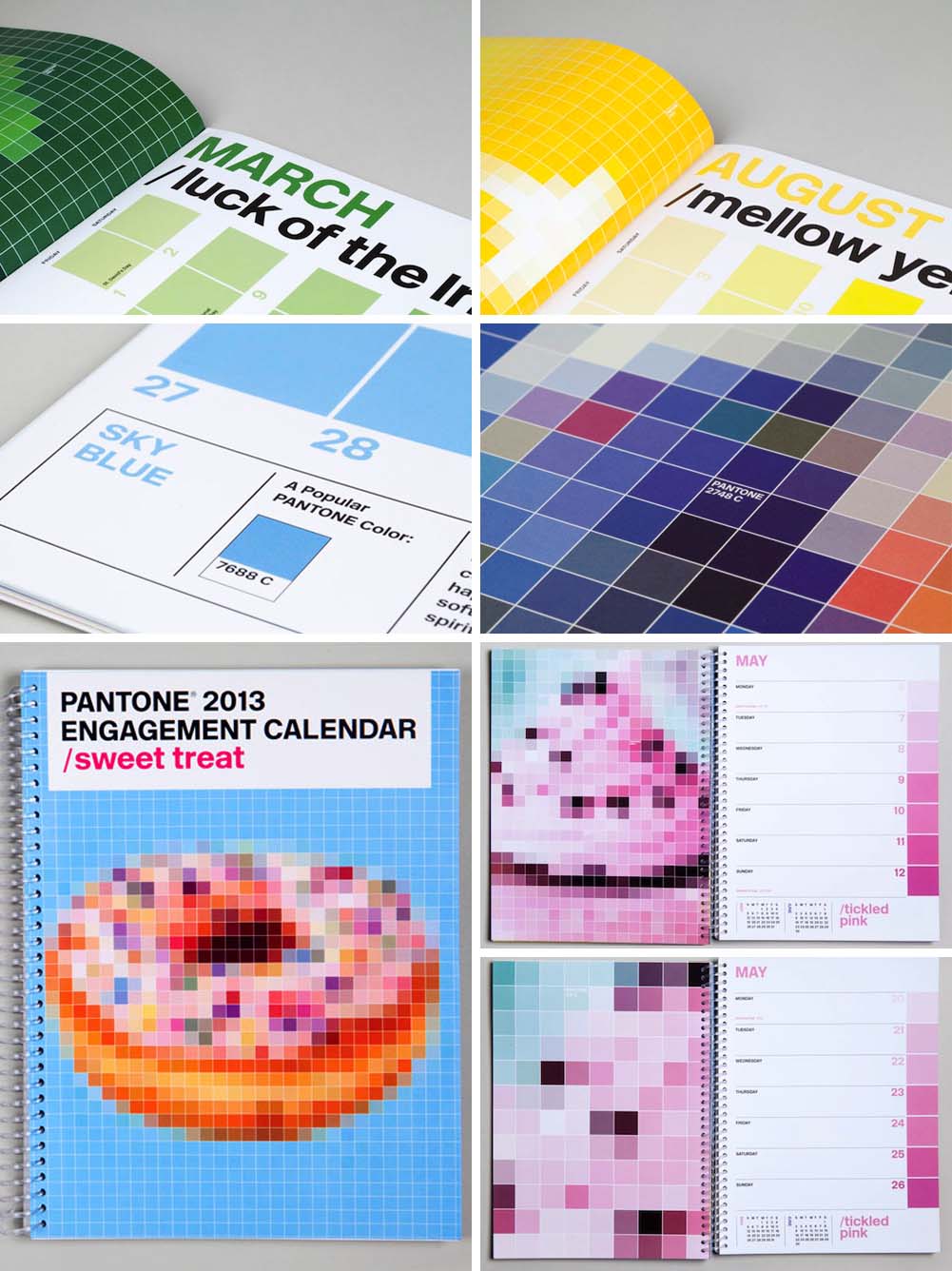 Eddie Opara and Brankica Harvey of Pentgram have designed the Pantone 2013 Wall and Engagement Calendars. Using the PMS color chips as image pixels, the designers created a “digitized” seasonal thematic image for each month, much in the way Vik Muniz recreated famous Impressionist paintings with Pantone chips (see here). Each month features a Pantone color and continues with tints of it, each a square for every day of the month.