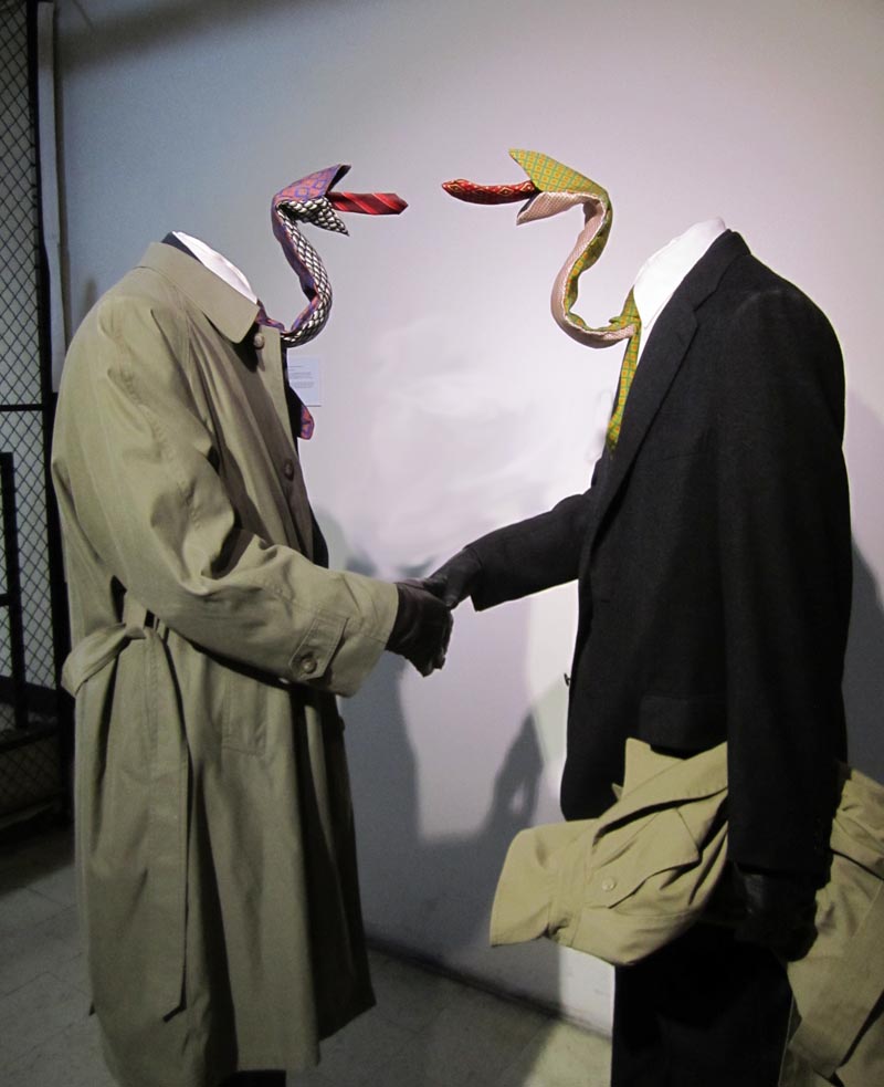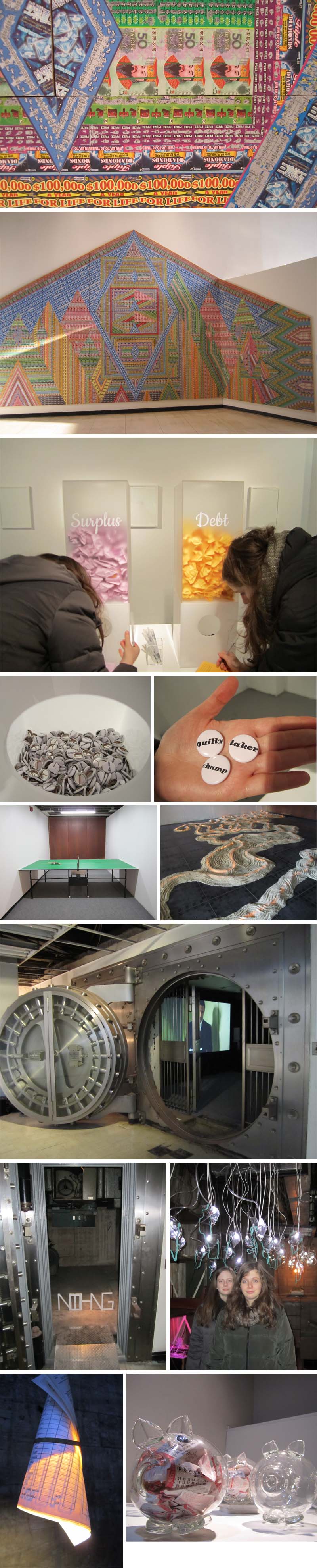 We had a lot of fun at this exhibit. Some of the highlights for us include Guerra de la Paz’s snake-like ties in his Sealing the Deal (top); Ghost of a Dream’s wall murals, both In Banks We Trust where the word TRUST drops out boldly from walls covered with handwritten questionably trustworthy bank slogans, and their other mural The Price of Happiness, a large-scale collage made up of losing lottery tickets and Buddhist afterworld money (second and third works from top); also, Theodoros Stamatogiannis’ Ping Pong table straddled tightly between two walls, symbolizing the lack of a level playing field in society.