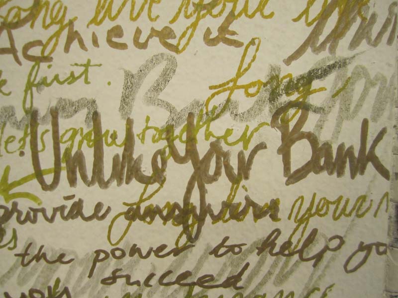 Inspired by the Bank building, 26 artists from 15 countries take on the topic of money and its value during these tumultuous economic times of growing debt and job insecurity. The space is filled with large-scale murals, installations, and videos, in addition to interactive areas that are especially kid-friendly such as drawing your own “Fundred” dollar bill at one installation, and filling in forms on ‘Surplus’ and ‘Debt’, considering the concepts beyond the monetary significance, as well as offering up humorous buttons on the themes.