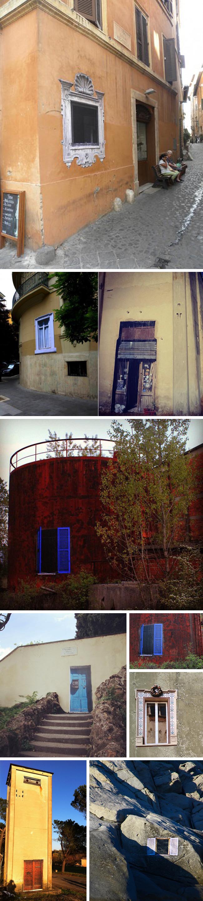 The art collective Sbagliato (meaning “wrong” in Italian) pastes images of windows and doors in the most unexpected places, suggesting a way inside and adding a surreal quality to the ordinary; makes me think of the holes in the Yellow Submarine. The anonymous group redraws urban surfaces, promoting a new reality by subverting order and changing landscapes — in some cases existing buildings, in other cases rock formations, and in still others stone walls by the river banks — by adding a twist with their surprising windows, shutters, and doors.