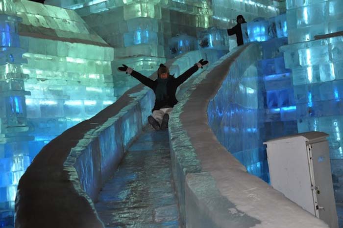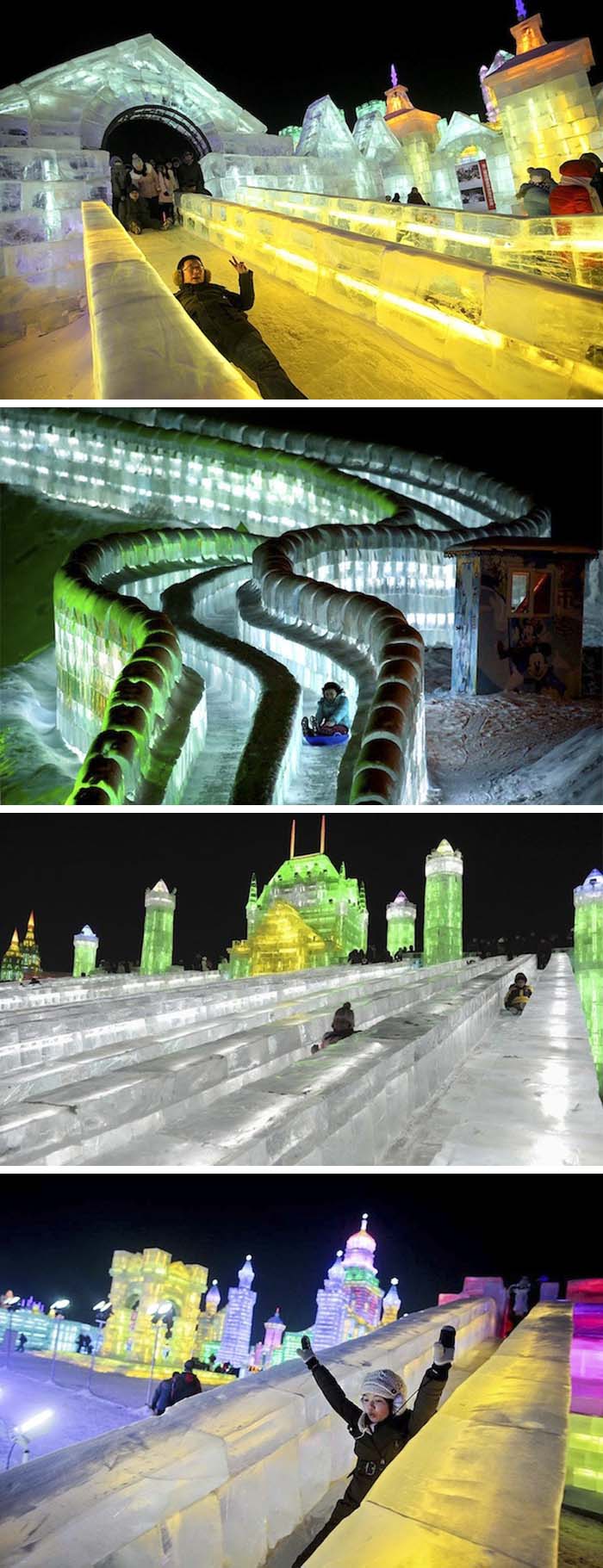 This looks very fun and cool (in the literal sense as well.) These castles made using ice with multiple slides and lit with colorful LED lights are part of the 29th Harbin International Ice Festival in China. In addition to the ice architecture, the festival includes many a giant ice and snow sculpture. The Harbin Festival started 10 years ago and has grown to be one of the world’s biggest ice festivals with tens of thousands of people working on the displays. The castle and slides are especially spectacular at night with their pastel hues emanating from within the ice. The slides are not only fun, but they serve as a means of transportation to get around the grounds.