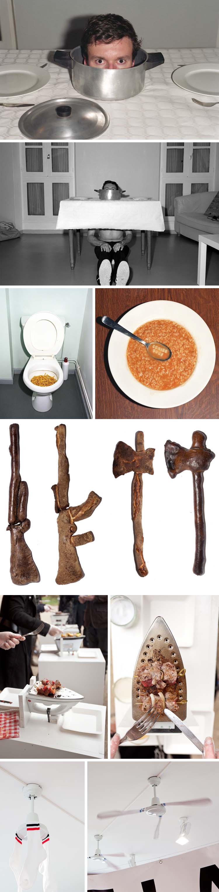 Thomas Mailaenderis Paris-based multimedia artist who started out doing documentation work. These comical food-related photos, sculptures, and installation are all included under the name L’Union Fait la Farce (The Union is a Farce) which is a play on words with the motto L’Union Fait la Force (Unity is Strength.) The zaniness in these really appeals to me, from the unique coffee-serving technique up top, down to the yakitori-grilling iron and the sock fan at the bottom. All of it cracks me up.