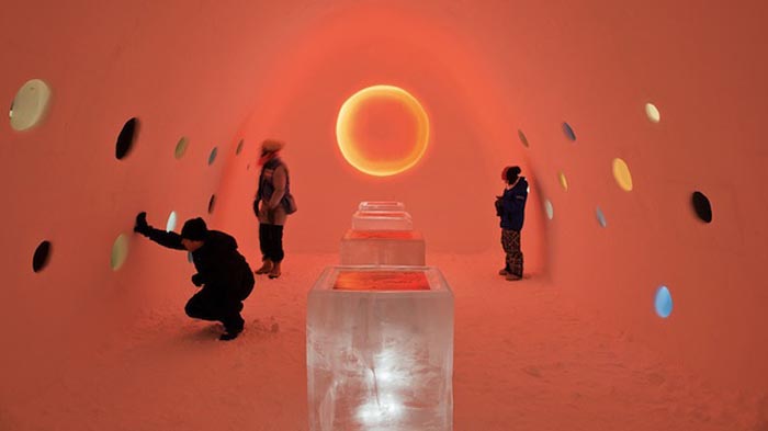 Have you ever wanted to ski in and out of an art exhibit? Well, here’s your big chance. On view now until it begins to melt (approximately mid-April) next to the Icehotel in Sweden is photographer/sculptor Anna Öhlund and lighting designer John Petterson’s light and photography exhibit titled A Warm Story about a Cold Place. Located in its own snow and ice building, the ephemeral exhibition captures the ever-shifting and momentary Arctic light and life of the frozen hotel. The light cycle in the exhibit runs 15 minutes and photographs are positioned within both circular cutouts in the walls and big free-standing ice blocks. Very cool in all meanings of the word.