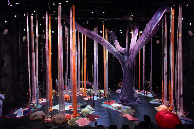 Though at first glance it may look like a theater set for a children’s fairytale, PearlDamour’s (Katie Pearl and Lisa D’Amour) How to Build a Forest has more to it than that. Em stopped by the team’s latest installation, of their previously-staged performance art piece, last week at Brown University’s Granoff Center. Part visual art installation and part theater performance How to Build a Forest unfolds over an 8-hour period, beginning on an empty stage which is slowly transformed by the artists and their volunteers into a coloful, dense and willowy slip-covered forest. Viewers are urged to walk through and interact with the installation as well as ask (or answer) questions of the forest rangers on hand. Field guides were distributed that include a manifesto on the beauty and fragility of our environment. Visitors are given an opportunity to witness an ecosystem in progress as well as question where things go when we are done with them. Despite the loud sounds by the builders and metal wires, the installation has a meditative quality.