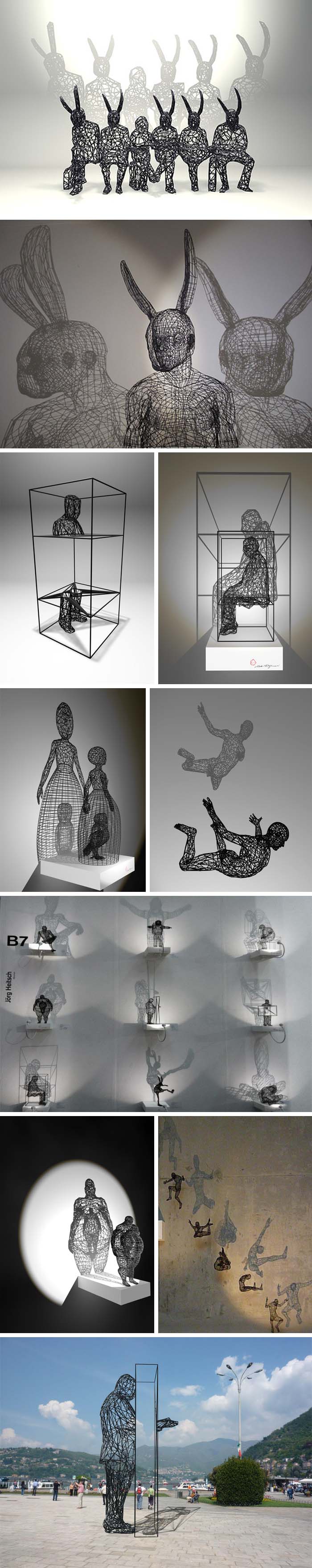 German artist Moto Waganari, aka Lutz Wagner, creates intricately networked polyamide and wire sculptures that in themselves are quite striking but then takes the three dimensional objects to another level by lighting them and having them interact with their very dramatic two dimensional shadows. The result is somewhat surreal and often surprising revealing a sort of alter ego of the individual figures. And if that’s not interesting enough, Waganari has a website that lets you manipulate these figures, changing their shapes and somehow having them created. He calls it Real Virtuality. Here’s a video with more details: