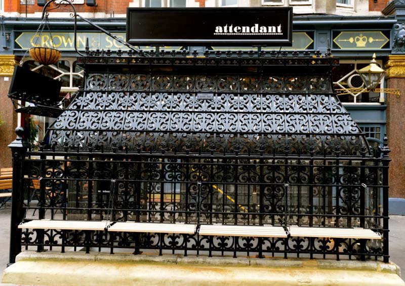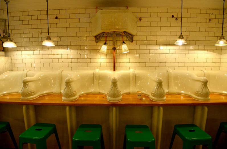 I’ve heard of sandwich shops with cool bathrooms (i.e. the now defunct Bar 89) but a bathroom-turned-sandwich shop? More specifically, an 1890s men’s urinal in London. That’s what partners Peter Tomlinson and Ben Russell did with their new cafe Attendant. After removing 12 layers of paint dating back to 1890 from the wrought iron entrance, cleaning up the stairs, and removing just a single wall from the downstairs space (see the before photos above), as well as investing $150,000 in the renovation including polishing up the urinals and inserting a wooden bar connecting them all, Attendant was born, with the kitchen taking over the old Attendant’s office space, hence the name. Definitely original, if a little strange.