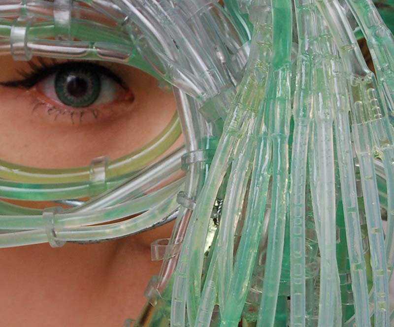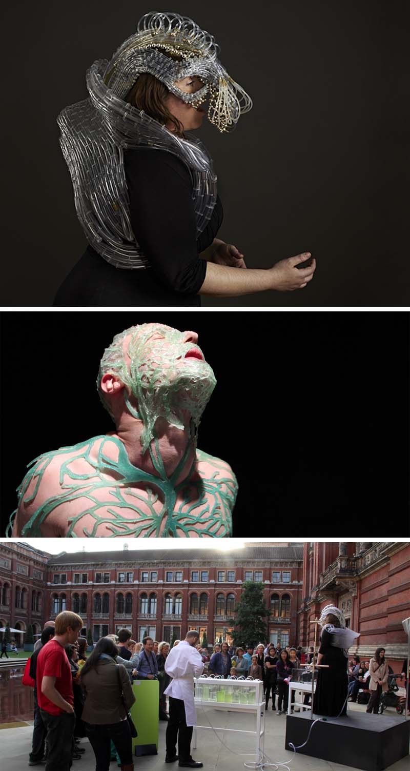 Will humans be compared to lichen, sea slugs and salamanders in the future? With the future in mind, U.K.-based designers Michiko Nitta and Michael Burton study and design alternative ways to fuel the body. Algaculture offers a symbiotic relationship between humans and algae. It proposes humans to be semi-photosynthetic allowing us to gain food from light, the way plants do and, apparently, lichen, sea slugs and salamanders. Burton and Nitta have come up with an Algaculture Symbiosis Suit enabling the mutually beneficial relationship with algae to occur. Last September, one of these suits was used in The Algae Opera at the V&A in London. An opera singer sang using her large lung capacity to produce high-quality algae-product. The photosynthetic plant-like organisms fed on the carbon dioxide from the singer’s breath, creating a sample of the future food source. The audience was not only invited to appreciate her music, but also to savor her unique blend of algae. If you think this sounds unappealing, think again; Burton & Nitta’s Republic of Salivation is much harder to swallow.
