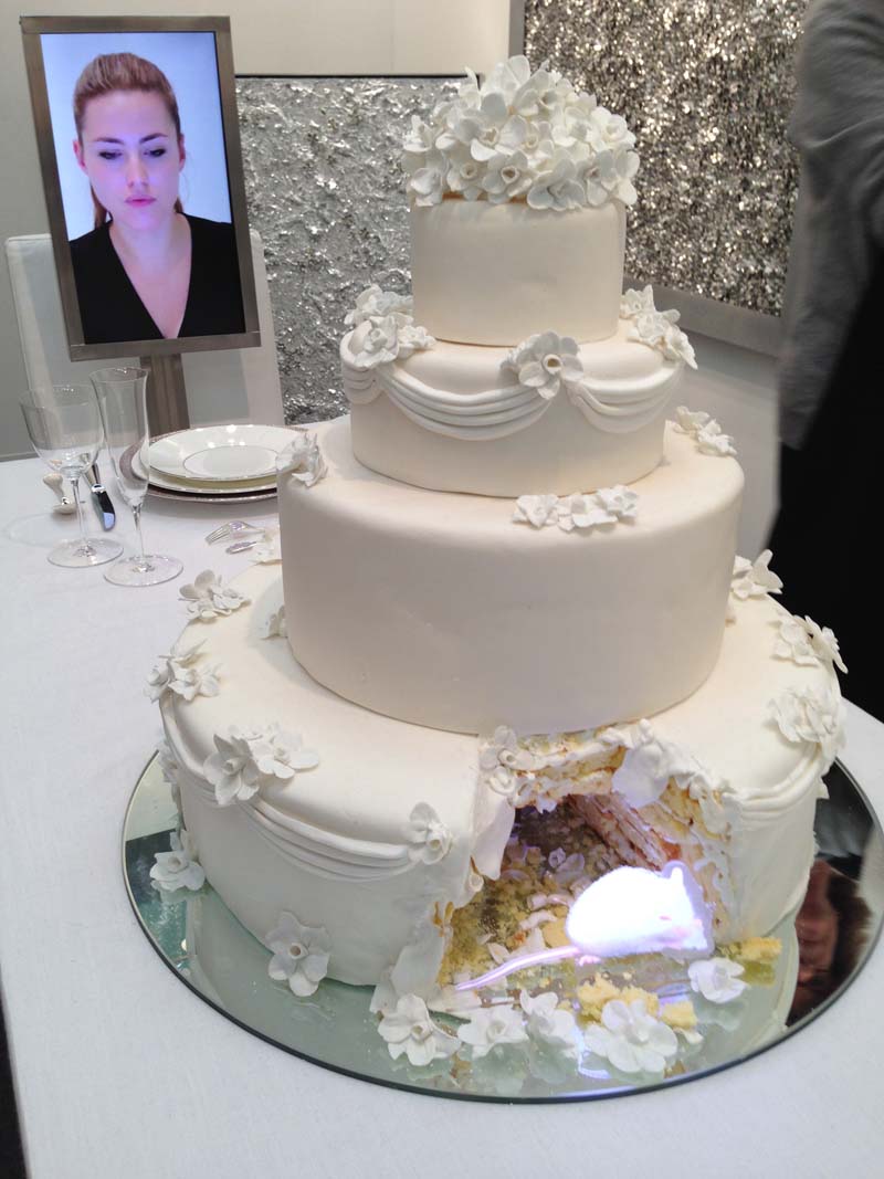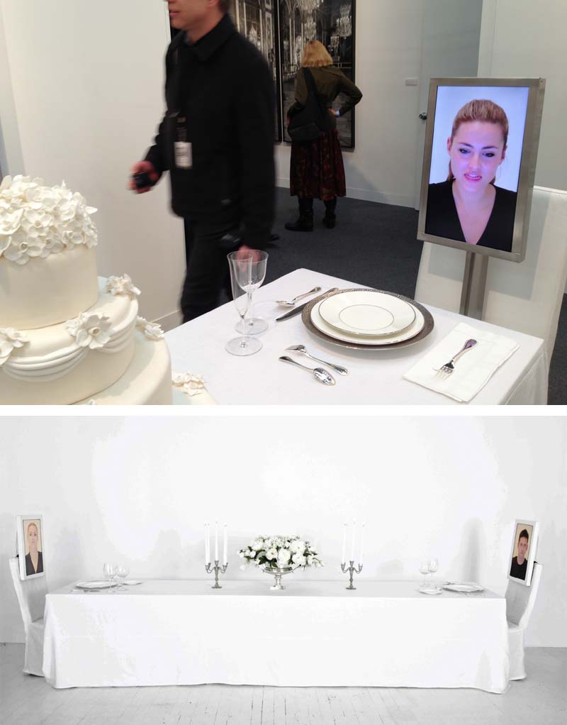 One of the crowd-pleasers at this year’s Armory Show was the mixed media installation Dinner for Two by Rachel Lee Hovnanian; an elegantly set 16-foot table with a multi-tiered (wedding?) cake standing tall in its center while a holographic-looking mouse nibbles away at it. At each end of the table is an LCD screen with a three-minute looped video of a couple, the man on one end and the woman at the other. Their eyes never seem to meet as they look down and around while the familiar sounds of texts and ringing cell phones are heard relentlessly. Hovnanian comments on the piece (via artinfo):