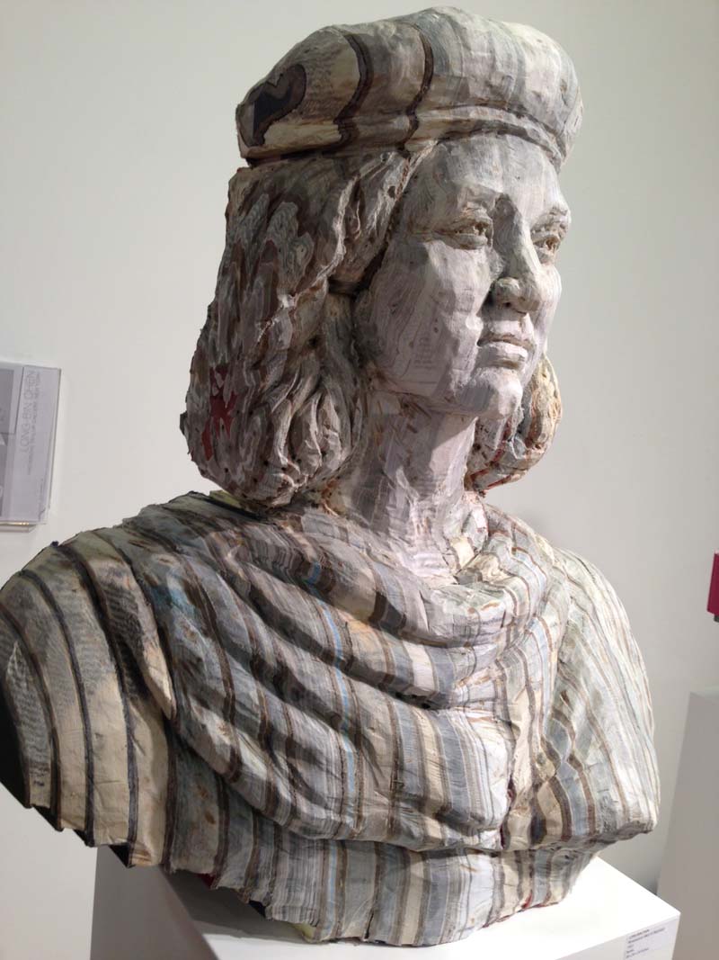 Taiwanese artist Long-Bin Chen works with books, magazines, and phone books using traditional sculpting techniques to carve them into works that resemble classic stone busts of both Eastern and Western icons. I saw several of these in person at this year’s VoltaNY Show and even seeing the front and backs up close, and knowing that they’re made with printed matter, they are still amazingly convincing.
