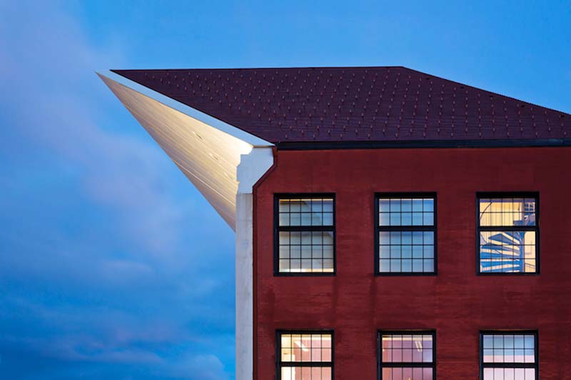 Architects Katrin Koov, Indrek Peil, and Siiri Vallner of Kavakava faced the challenge of designing a new building for Narva College in Estonia on the Old Town Square next to its baroque Town Hall, one of the only buildings remaining since World War II when most of the town was destroyed. Kavakava’s solution is a rather unique and clever one. The structure consists of two connecting volumes; the façade of the volume facing the Square was designed to match that of the building that originally stood in the same place, now curiously cast in concrete, with an angled roof that has been nicknamed “the beak.” I believe the idea is that seen from the front, “the beak” gives the illusion of emulating the angle of the original roof. The rest of the new building is made in a contrasting red brick exterior, offering the most modern facilities and study environment from classes to lecture halls. New and faux old working together as one. And check out that laser signage on the floor in the fourth photo up from the bottom. Very cool.
