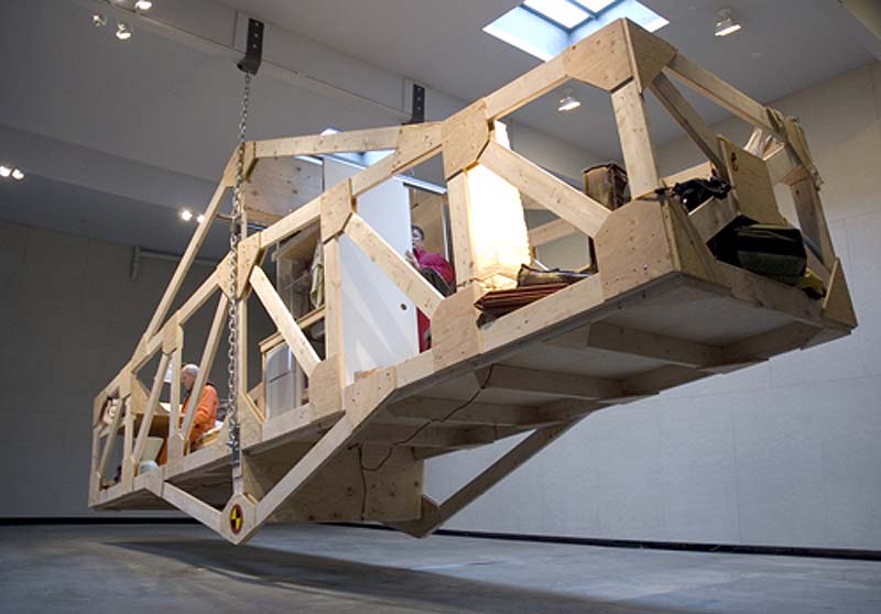 Alex Schweder creates installations that he refers to as “performance architecture”. Based on the notion that relationships between occupied spaces and occupying subjects are permeable, Schweder’s works often invite interactivity. Visitors follow their visual architectural instincts and once engaged, their expectations and perspective are challenged; what at first seemed familiar becomes strange. Top two images are from the pivoting and rocking Stability, which relies on the position and weight of its two occupants (in collaboration with Ward Shelley.) Snowballing Doorway (third photo down) is an inflatable installation with two arches in mirrored orientation, participants can pass through the bottom arch until the upper up-side-down arch starts to displace it. The next two photos are of A Sac of Rooms All Day Long another inflatable structure with something too big inside something too small. Roomograph, which follows, works like a photogram with photosensitive material that when the lights go out, occupants see their outlines as shadows. Counterweight Roommate forces vertical movement to rely on the counter weight of its two occupants, and was continuously inhabited for five days at Scope Basel in 2011. Split Skin (bottom left) is an installation of licked together packing peanuts that melts and contorts when in contact with water and lastly, The Rise and Fall, offers visitors a ground-shifting structure that responds to their weight and their movements with relation to one another.