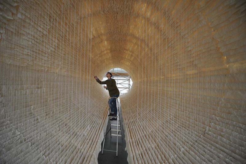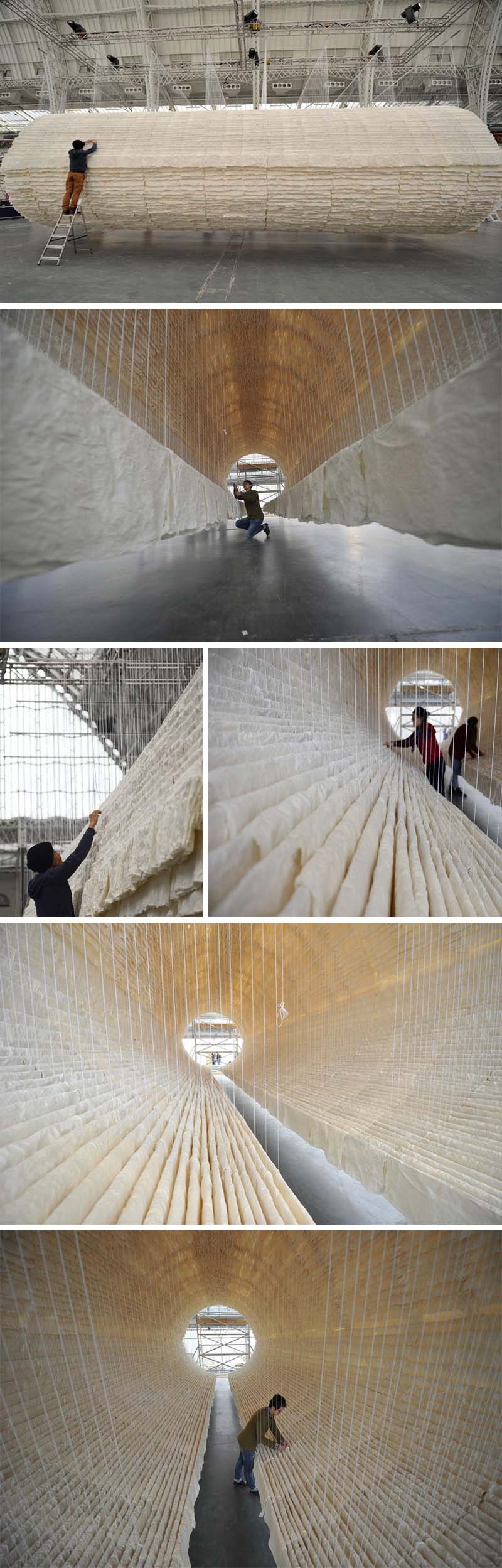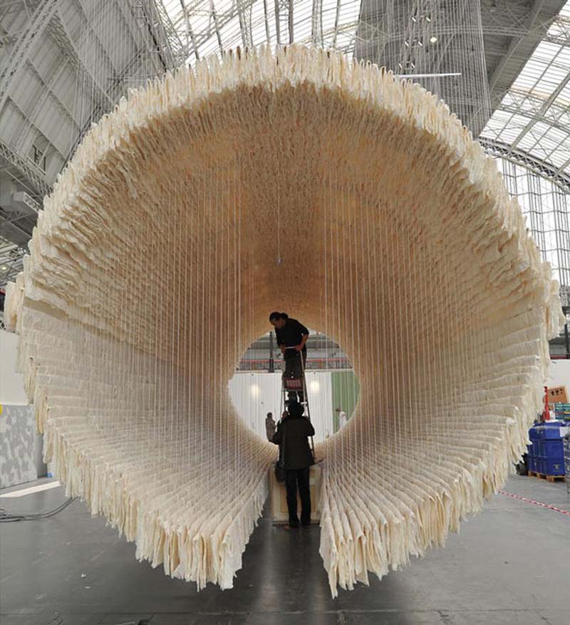 Consisting of 8,000 sheets of rice paper, 800 shafts of bamboo, and cotton, the 12-meter long structure titled Boat was presented last month at Art13 London by Chinese abstract artist Zhu Jinshi. The impressive installation was assembled over a three-day period by a crew of workers from Hong Kong who delicately layered the historically- and culturally-relevant paper onto the bamboo poles. The Boat acts as a metaphor with both western and eastern significance: the artist’s personal voyage from east to west; as well as honoring the dead’s passage from living to afterlife, something that Chinese viewers would recognize from the meaning of the Chinese character for ‘boat’. Even time travel could be insinuated by the spaceship quality of the interior.