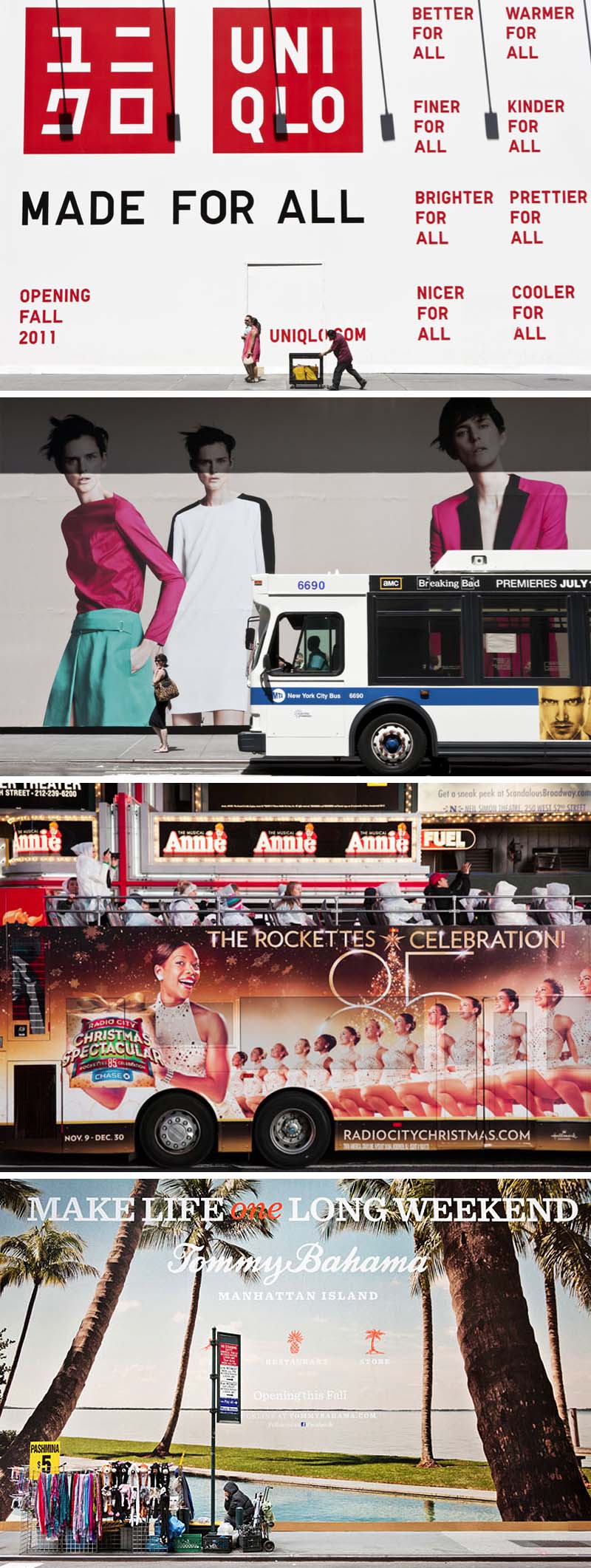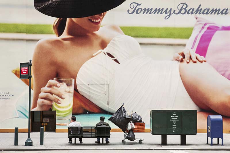 My favorite kind of street photography usually involves humor, but I’ve also noticed that I’m drawn to photographs that juxtapose large images, be they street art murals, bridge arches, or other structures, with miniature-looking people in front of them. Israeli photographer Natan Dvir combines both quite successfully in his series Coming Soon. Arriving in NYC in 2008, Dvir was struck by the super-sized ads/billboards at street level and their effect on the urban landscape, and began photographing them. The resulting images emphasize not only the evident contrast in size but socio-economic levels and ad-agency-dreamworld vs. reality as well.