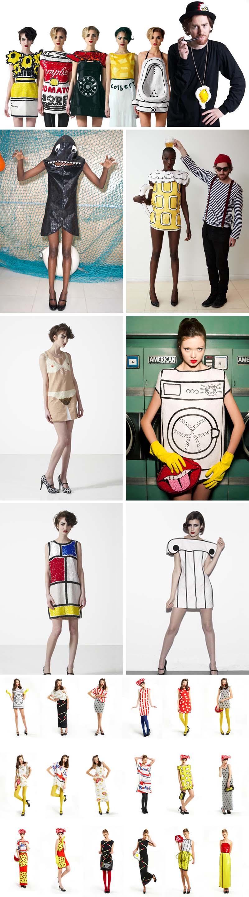 Em came across these very fun dresses—verging on costumes—by London-based designer Philip Colbert who calls his label The Rodnik Band. Inspired by art and driven by a strong sense of fun, Colbert’s designs “walk the humourous line between fashion and art.” The Rodnik Band Label is presented as an ironic pop band, where Colbert writes songs based on each collection that are performed at the runway shows. Colbert’s world is a wacky one that aims to reinvent the way people look at fashion. I’d say it’s working.