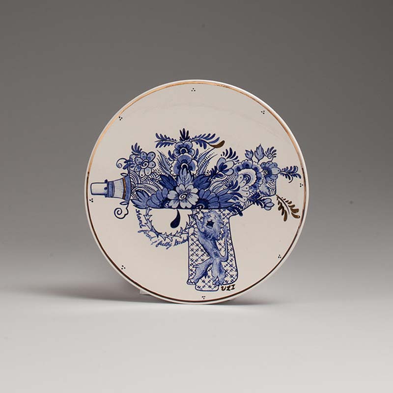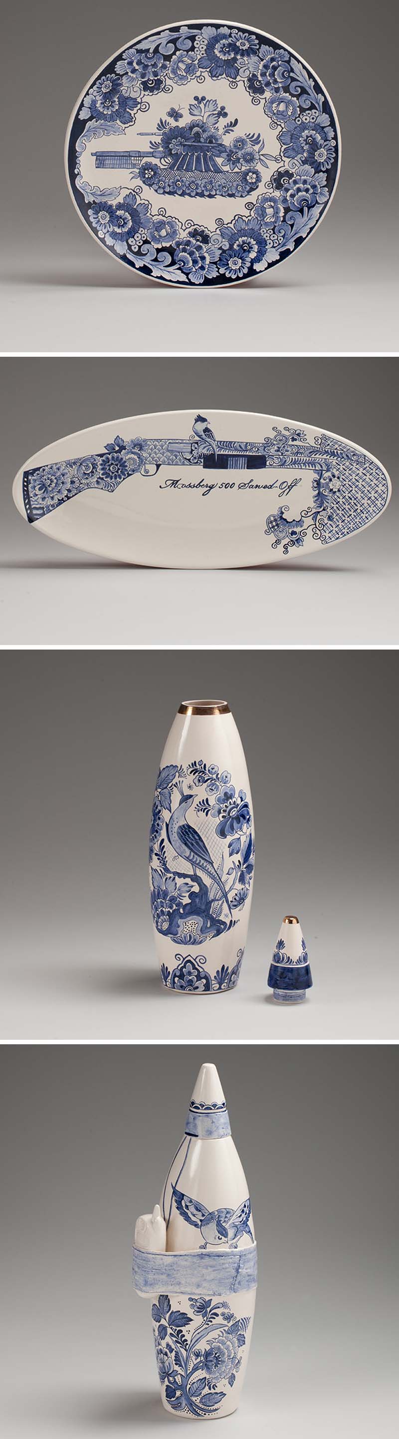 I’m not exactly sure what designer/artist Trevor Jackson had in mind when he made these plates, but on the day after the U.S. Senate disappointingly blocked gun-control legislation, and based on the moniker “Agitdelft”—from Agitation Delft akin to Agitation Propaganda— under which the Seattle-based Jackson creates these ceramic works, I’m going to choose to interpret them as a make-love-not-war/pro-gun-control statement.