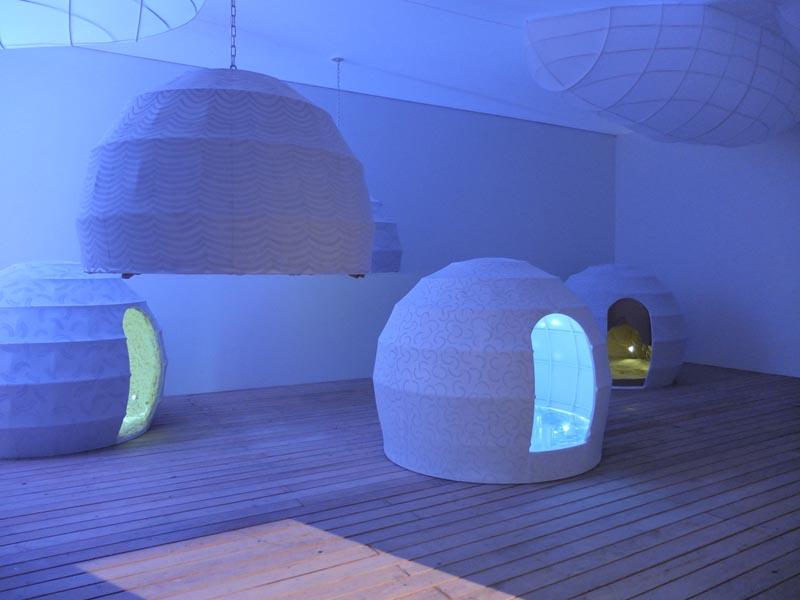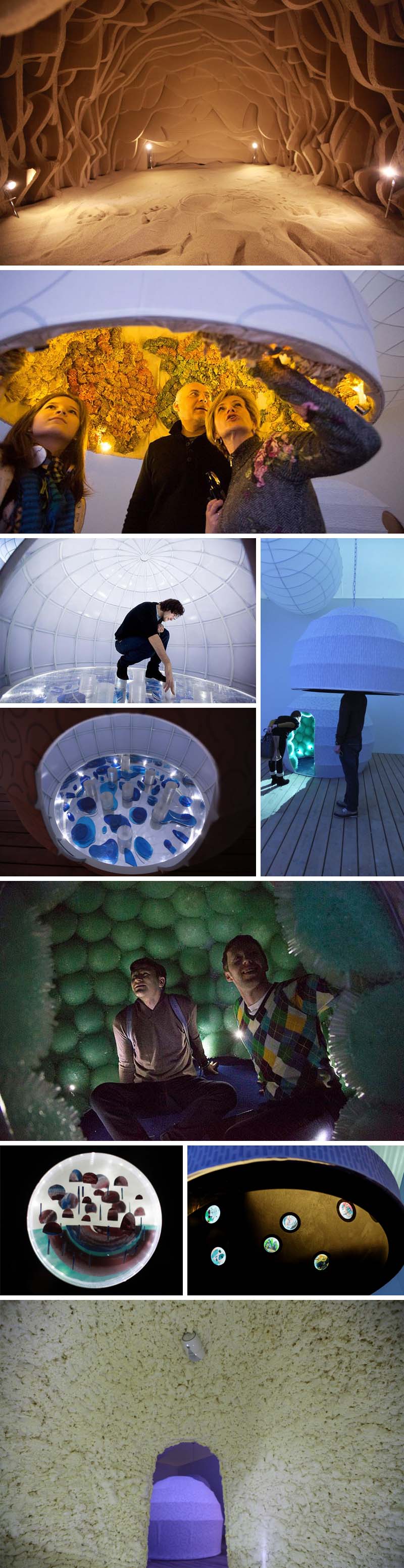 Currently studying at the Slade School of Fine Art in London, Singaporean artist Danielle Tay works in a variety of mediums though up until recently they seem to mostly be limited to walls. Her most recent work appears to be a bit of a departure, stepping into immersive installation art with her work PODS showcased at the Garage Center for Contemporary Culture in Moscow this past January in their very appropriate Art Experiment 2013 show. Each pod had a different interior, some were crawled into, others acted more like canopies, but all of them seem to have offered a very cool environment to its visitor.