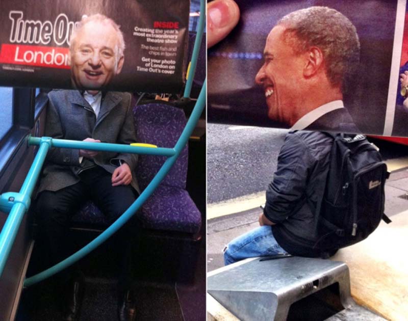 These cracked me up. Someone (an anonymous commuter) has definitely found a way to keep themself entertained on their daily commute to work. There’s definitely an art to these, as simple as the concept may be. He/she really have matched position and even tonality on most of these folded newspaper mashups with unsuspecting co-commuter bodies. Nicely done.