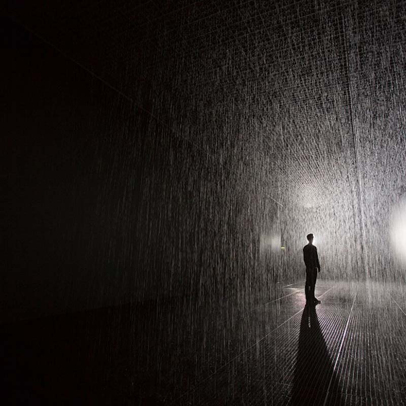 Rain Room is a large-scale environment (in the case of MoMA, it’s a separate entity outside the museum on 54th Street) with a field of pouring rain whose flow is suspended detecting the presence of bodies, allowing visitors to wander around the room amidst the beautifully highlighted drops, without getting wet. Injection moulded tiles, solenoid valves, pressure regulators, 3D tracking cameras, custom software and steel beams are involved in the production of the installation. Definitely fun and cool, making for some stunning photographs (better ones if you opt for camera over phone) and lots of kids running fast trying (and mostly succeeding) to get wet.