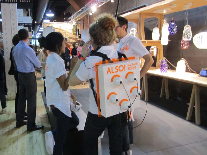 I personally only interacted with three of the projects but witnessed two others in use. The students were very engaging and enthusiastic, happy to explain their project to everyone interested and eager to get people to interact. With informative stickers at the ready to paste on your arm or leg, and kaleidoscopic interpretations of the surroundings, as well as viewfinders with images focusing on some of the unnoticed subtleties of the venue, these young designers were excited about the event and what their project brought to it. And rightly so. The Also Project showed creativity, interactivity, and focused on product design from function and form, through to branding, uniform-design, gadgetry and teamwork. Not to mention fun. Hats off to instructor and industrial designer Sinclair Smith of SVA’s Products of Design MFA program for taking his students on this great design journey.