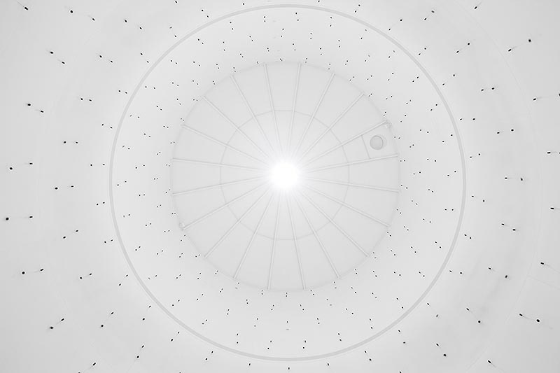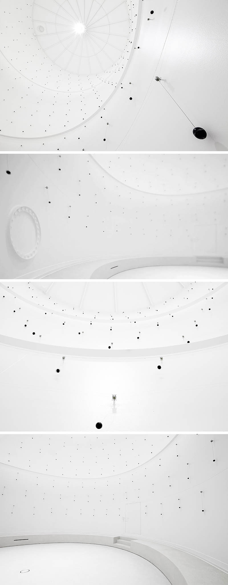 This must be pretty incredible to see in person. And noisy. And possibly smelly if they haven’t gotten all the paint thinner smell out of the tank. Swiss artist Zimoun has been creating “architecturally-minded platforms of sound” for several years. I saw one of his cardboard box installations over a year ago at the Bring to Light Festival here in NYC. His latest work is a permanent installation utilizing 329 prepared dc-motors, wires, cotton balls, lights and a circular bench all inside of a former toluene tank in Dottikon, Switzerland. The contrast between the loud sounds of the interior and the quiet of the snowy exterior are emphasized in the video below. There’s a chaotic order to the installation. It’s exciting to see this next dimension to Zimoun’s work and the interesting repurposing of an abandoned tank. (Here’s another repurposed tank in Spain.)