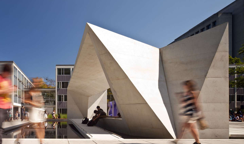 The University of British Columbia (UBC) invited Vancouver-based architecture and design firm Public together with landscape architects Phillips Farevaag Smallenberg to revitalize the courtyards between the existing Buchanan buildings, home to the Faculty of the Arts. Their solution: two dynamic spaces; one for contemplation and relaxation and the other for gathering and performances. At its center is a striking and twisty concrete pavilion, a sculpture in itself, which rests in a reflecting pool that contains typeset quotations in radiating rings mimicking the logo for The Arts whose identity was also designed by Public. In addition to being a visually pleasing place to spend time, by including the new reflecting pool the designers solved a chronic storm water management problem that plagued the space.