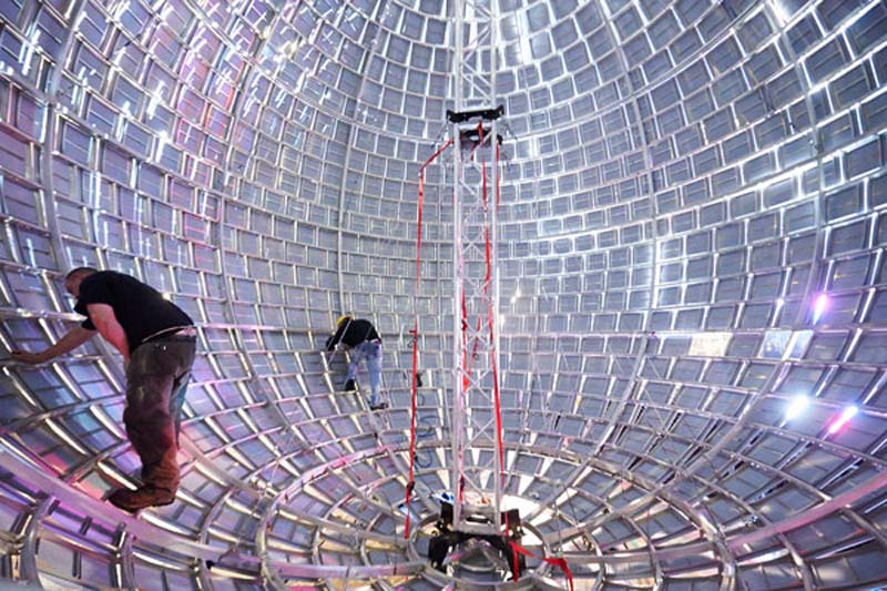 Canadian artist Michel de Broin adopts a critical and playful attitude towards common objects and ideas. For the Luminato Festival, going on currently in Toronto, Broin created his installation One Thousand Speculations, a 7.9 metre in diameter ball made up of 1000 mirrors that will be lifted 80-feet above the ground of David Pecaut Square each night of the Festival. The largest disco ball in the world will spin, twinkle, and reflect against the buildings around the square for the duration of the festival. Fun!