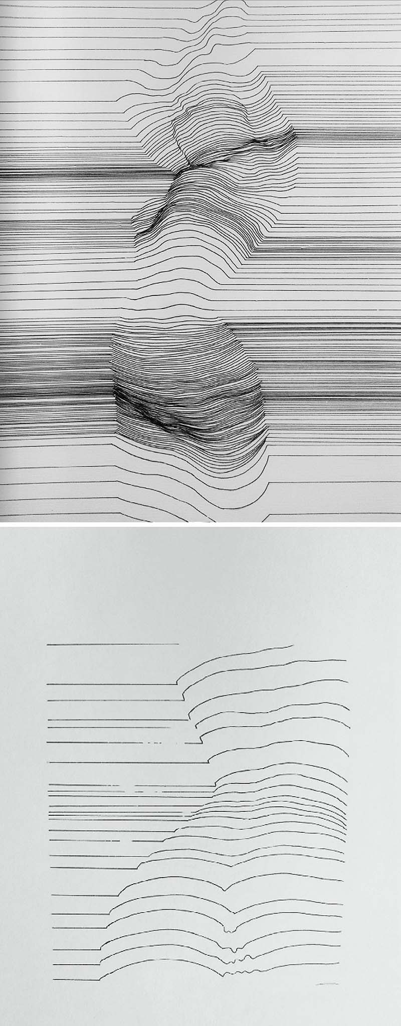 Alexi K, a painter/illustrator in Birmingham, UK, creates everything from this series of minimalist black and white line drawings titled Cognitive Polygraph, to boldly colorful and elaborate street murals. I love how so much form and movement is delivered in these pen drawings with just the use of horizontal rules. Impressive.