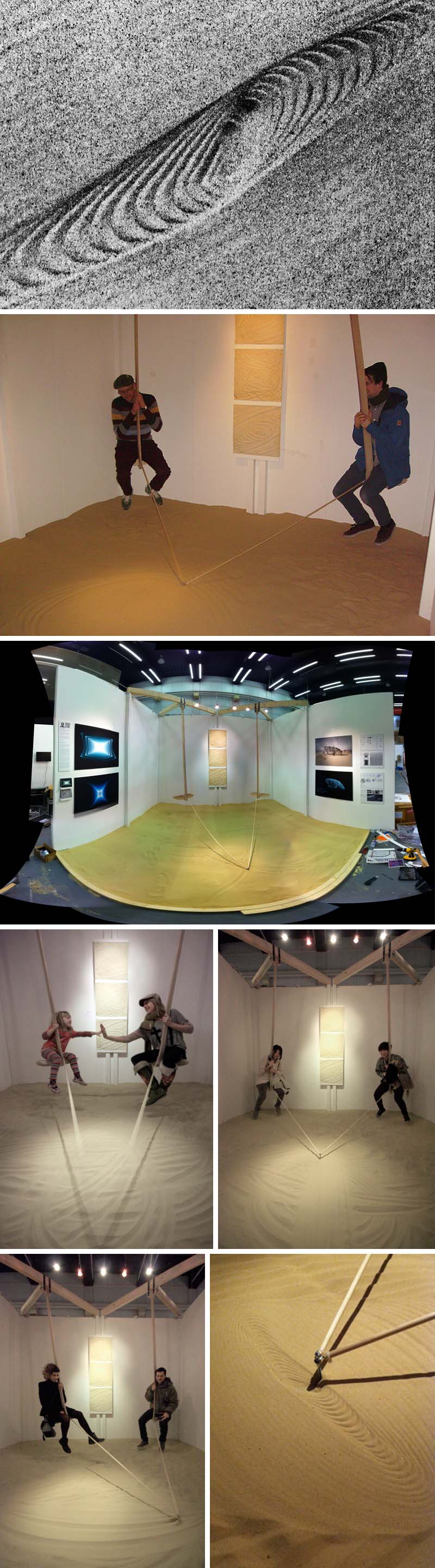 UK-based architectural designer and artist, Dan Dodds, has proposed an installation for Burning Man 2013 titled Near Unison that visualizes the harmonic relationship between two people using a pair of pendulum swings. A prototype of Near Unison, sans the elegant and striking exterior structure, was exhibited at this year’s Kinetic Art Fair. The installation specifically explores the harmonograph — a machine that became popular as a 19th century capable of producing beautiful drawings by mapping the relationship between two swinging pendulums. The oscillation frequency of the pendulums can be changed by modifying their lengths. Near Unison acts as a large-scale interactive harmonograph, allowing people to take the place of the pendulum weights, swinging back and forth, creating patterns in the sand that are ‘near unison’ a 1:1 ratio when the people occupying the swings are of similar weight. You can see the prototype in action below and keep your eyes peeled for the even larger version at the next Burning Man Festival in Black Rock Desert this August. Should be fun.