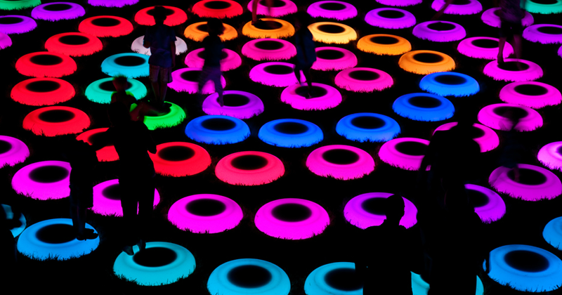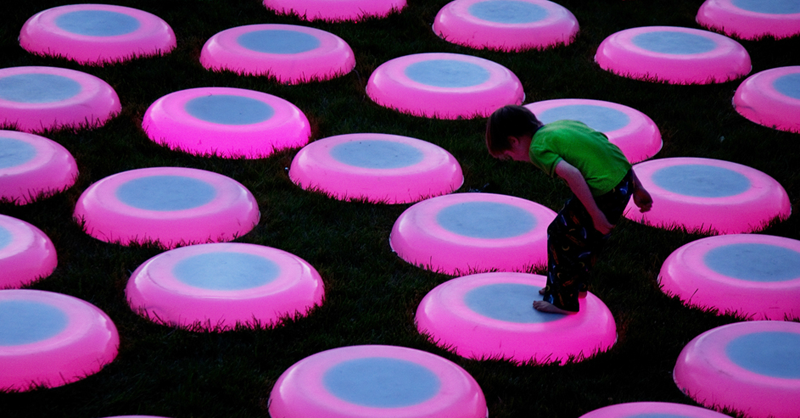 Colorado-based artist/architect Jenn Lewin creates large, immersive, interactive art pieces for the public. From interactive sound and light sculptures that inspire people into play, to woven fiber video curtains that reflect movement, or giant, robotic, ethereal moths that dance based on human touch. In her interactive light installation titled The Pool, Lewin put together 106 interactive circular platforms in giant concentric circles that communicate wirelessly. Each pad is independent and simultaneously interacts and listens to its environment based on user feedback. Together, the 106 pads create complex, surprising, and unpredictable color arrays with their user participants. Each pad in The Pool senses a person’s movements. User inputs such as foot location, foot pressure, and speed are sensed by the pad surface. As a person moves, light ripples out to the surrounding pads. For example, by leaning left, a ripple of varying intensity starts in that direction. A stronger more deliberate lean could cause a ripple to jump rings and fill the entire Pool. Each person’s ripple is unique. The more people that participate the more of a cacophony is created.