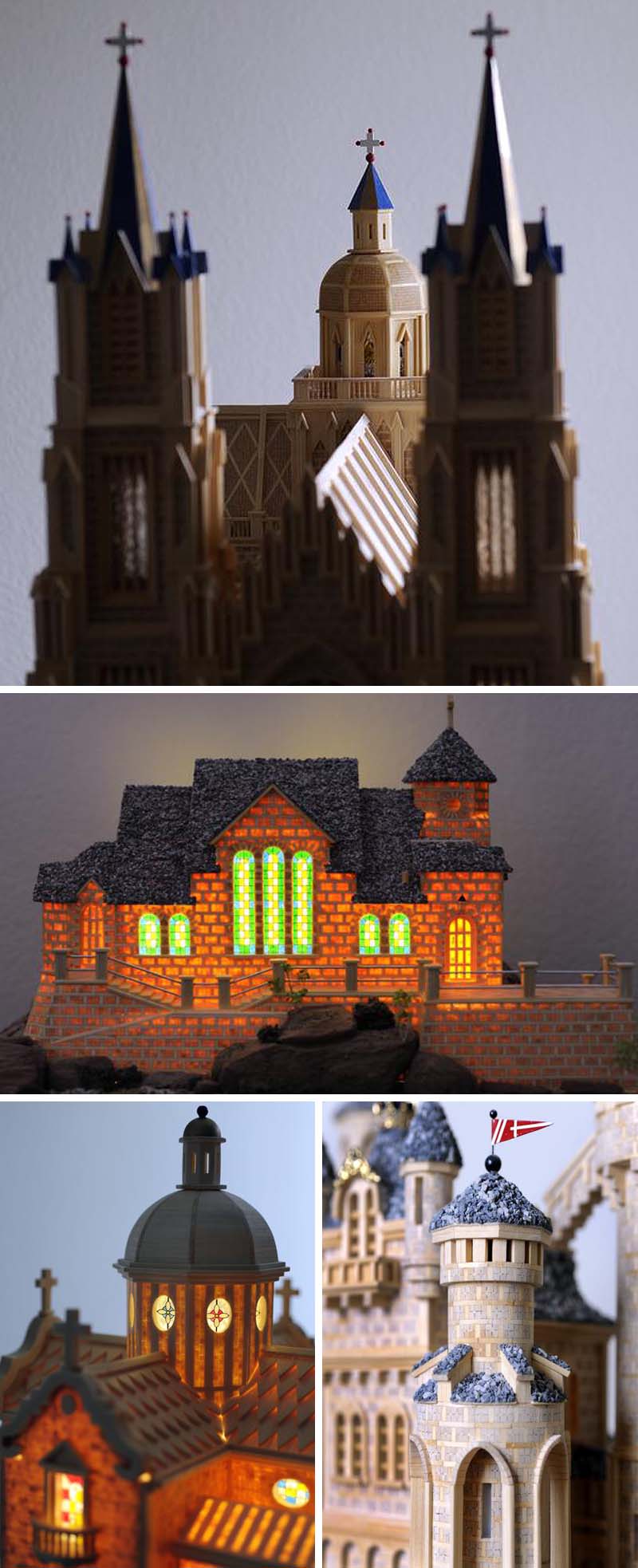 Artist Paul Marti of Englewood, Colorado builds elaborate architectural constructions such as cathedrals and castles using only matchsticks. These intricately designed pieces are not replicas, but rather original artworks conceived by Marti in his head, from their rounded towers and elaborate arches, to their painted stained glass. He solves the construction problems the way an artist does, by envisioning something beautiful first, then executing it. The detail on these is impressive. The “brick” facades are created by stacking cut matchsticks, and even the gravel is made with chopped and painted matches.