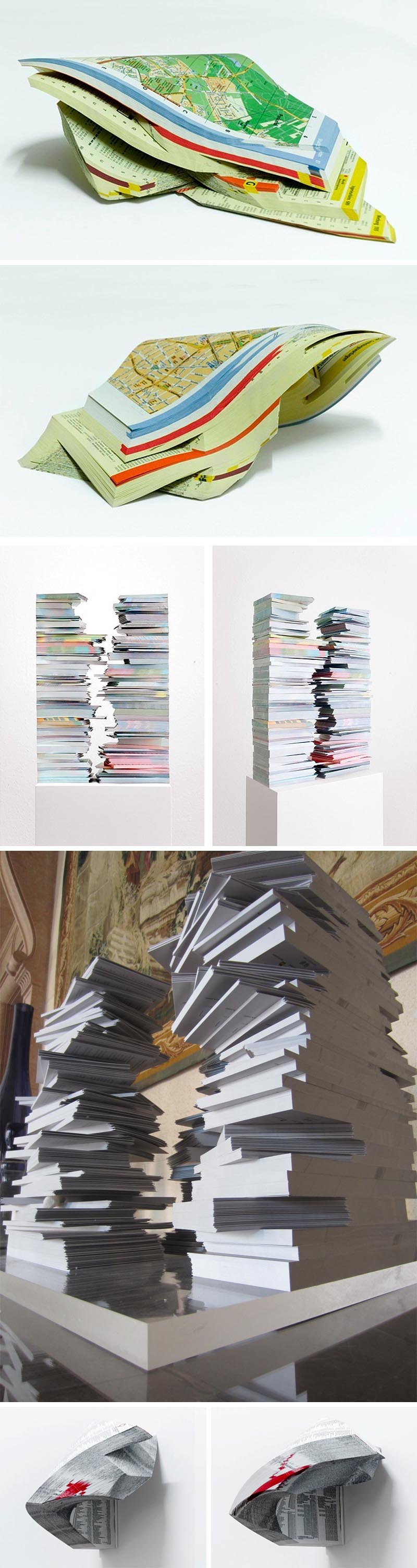 Berlin-based Italian artist Gemis Luciani upcycles phone books, magazines, brochures, and other similar objects into sculpture. By manipulating, de-composing and re-assembling the books and pages he reconfigures them into newly built systems of shapes and surfaces. His collages and spatial, large scale installations are meticulously created, and rely on a strong minimalist aesthetic. You can see more of Luciani’s work on his website here.