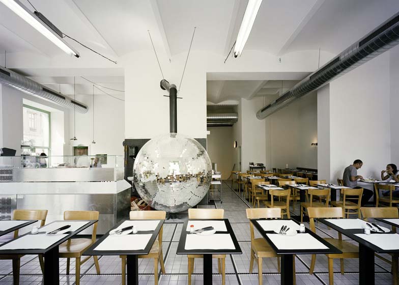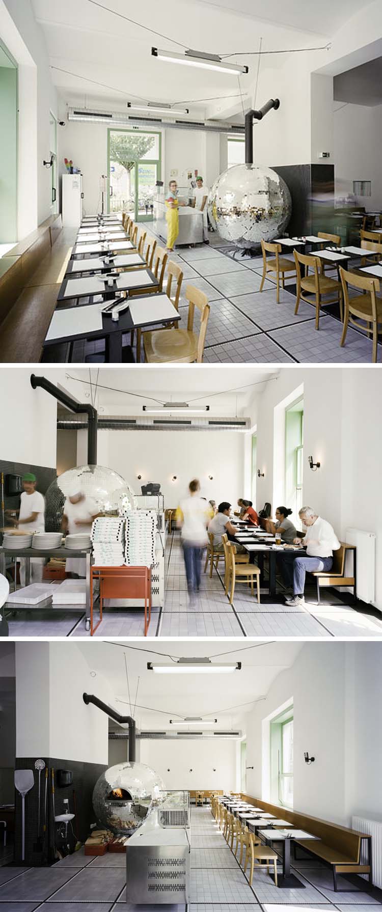 Austrian architect Lukas Galehr (also part of the design collective Madame Mohr) designed the Viennese pizzeria Disco Volante including its centerpiece: a unique oversized rotating disco ball oven that glitters against the walls in the dark. Covered in hundreds of tiny mirrored tiles, the spherical pizza oven is positioned within the dining room and is anchored to a central chimney that allows it to pivot from its center. Here it is in action: