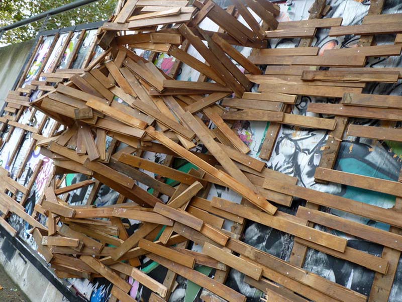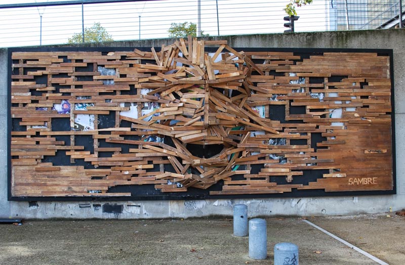 French street artist Sambre recently finished a new work at Le MUR XIII in Paris (looks to be a similar situation to NYC’s Bowery Mural with alternating artists’ works throughout the year) in the 13th arrondisement. Using found wood, the artist superimposed a sculptural piece with a protruding face at its center over the previous Le Mur XIII mural. Sambre had previously created an impressive installation in wood at Les Bains Douches (if you have a couple of minutes, check out the video below, it’s kind of amazing) this past summer, but this appears to be his first outdoor wooden piece.