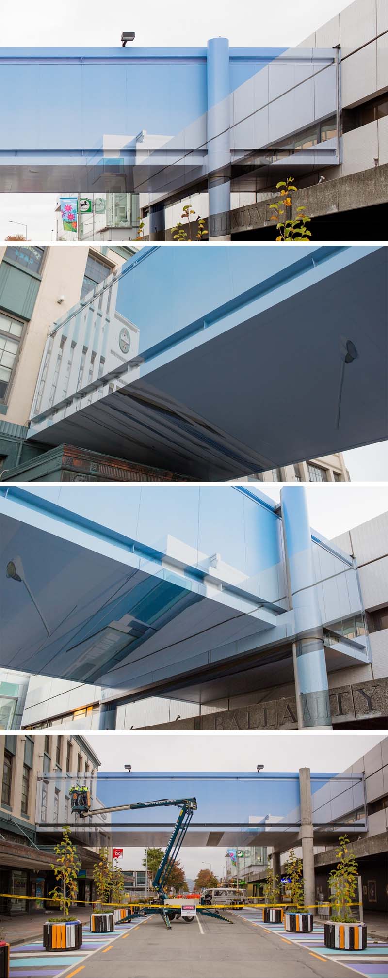 New Zealand artist Mike Hewson (previously here) is playing with people’s minds again. This time the trompe l’oeil specialist has has covered an elevated walkway in Christchurch, NZ over its main thoroughfare, Colombo Street, with anamorphic large-scale digital prints of the two buildings connected by the walkway. When standing at a particular vantage point on the street below, the art visually deletes the overpass. When viewed from other spots the work looks distorted. Hewson’s objective in this post-earthquake affected area is to paradoxically reconstruct the site through a process of deconstruction, reflecting Christchurch’s recovery process of adding new development through the “deletion” of crumbled buildings.