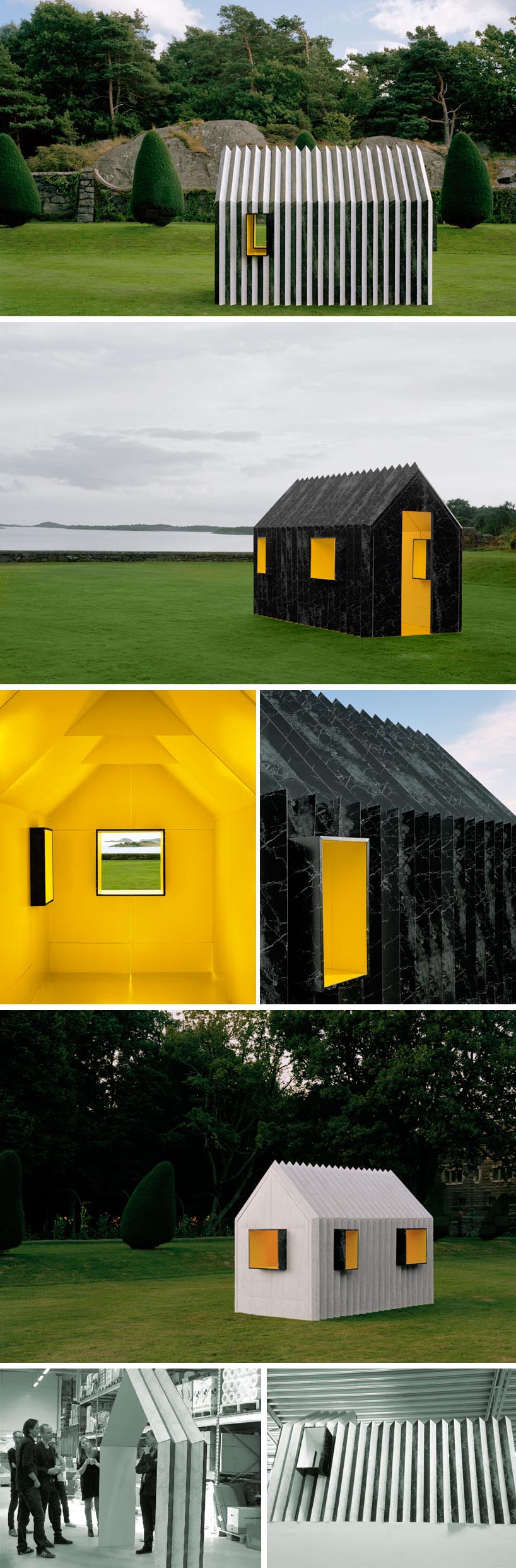 The Scandinavia-based architecture firm White Arkitekter has created a tricky all-paper cabin titled Chameleon Cabin. Made of corrugated paper and weighing roughly 100 kilos, looks like white marble from one angle and black marble from the opposite one. Using a simple system of tabs and slots, 95 paper modules—printed in white on one side and black on the other—were attached to form a cabin the proportions of which were based on those of a Swedish friggebod, a shed that can be built without planning permission. The modular system could be used to create longer structures as well. The bright yellow interior is a great glowing touch.