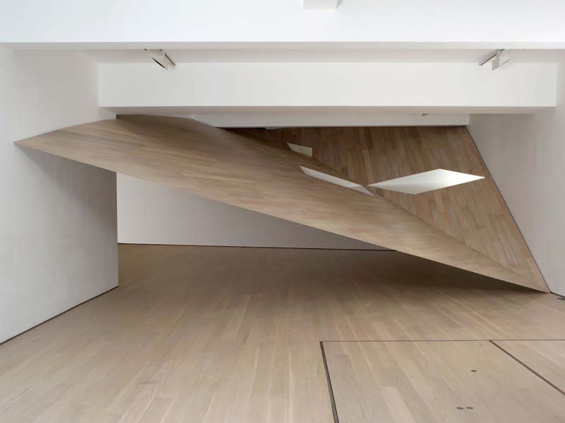 NYC-based artist Sarah Oppenheimer‘s work blurs the line between sculpture and architecture. Her amazing installations usually involve moving walls, slanting floors, and creating apertures—sometimes symmetric, sometimes asymmetric, and often with mirrors—that would mesmerize (and confuse) the most resistant of gallery/museum guests. Much in the way James Turrell or Doug Wheeler can create spatial confusion with light, and Richard Serra can take over a space with his torques, Oppenheimer makes the gallery itself—and the experience of walking through it—the art. All her works are identified by letters and numbers such as D-33 (second photo from top) making them all the more abstract. Each work is meticulously planned with mechanical drawings and engineered load tests, then executed with precision. I can’t wait to see one of these in person.