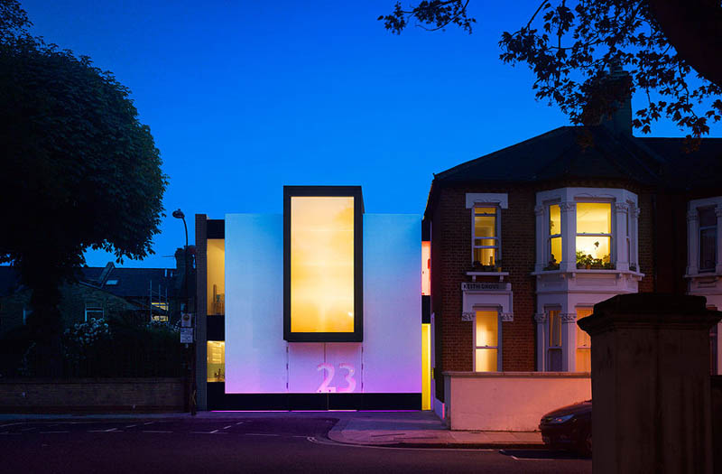 In addition to its sleek, minimalist design, this West London private residence dubbed Number 23 (based on its street address) designed by and for Matt White of MATT Architecture, is very playful. From the camouflaged front door with a very cool cut-out 23 and the humorous “hello” right above it, to the large single window jutting out of the façade with its electronically ‘switchable’ glazing—an LED technology that creates opacity for privacy with a mere flick of a switch—to the climbing wall and little messages such as “boo” in neon inside the bar cabinet and the “I don’t have OCD” mugs in the kitchen, these guys definitely had fun working on this home. Plus, the simple elevation conceals a house that is 30% bigger than its neighbors, despite occupying a 20% smaller plot and also includes various concealed technologies that dramatically reduce the energy consumption and running costs for the family. Magic. Humor, trickery, energy efficiency, and style…what more could a person ask for in a design?