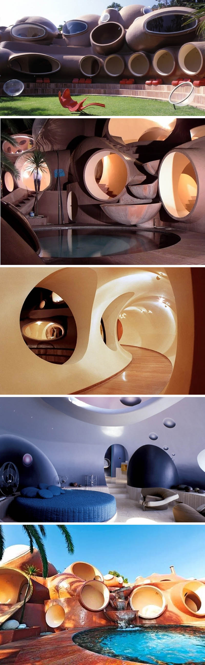 Le Palais Bulles or “Bubble Palace” designed by Hungarian-born architect Antti Lovag who grew up in Scandinavia, sits on the Mediterranean in the south of France and was originally the home of Pierre Cardin. Now the Palace of Bubbles is a private event venue that hosts grandiose weddings, posh parties and other exclusive events as well as serving as the backdrop for many fashion photo-shoots and films. Somewhere between futuristic moon house and groovy 1970s pad, like it or not, the house is one unique piece of architecture. It seems that Antti Lovag spent many hours of his Scandinavian childhood building snow forts in the style of igloos and eventually became the preeminent architect of bubble architecture as well as designer of circular furniture. Lovag has at least two other of these bubble homes credited to his name, previous to this grander Palais near Cannes.