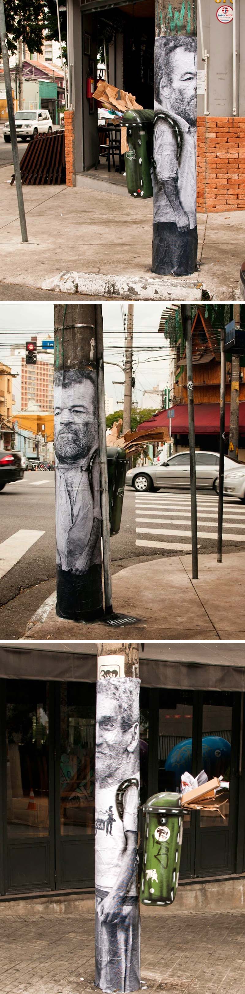 The German street art trio Mentalgassi (previously here) joined forces with Mundano in São Paulo, Brazil, to create this clever series of characters donning their customized trash backpacks for Pimp My Carroça, an environmental and cultural group that aims to add a little color and humor to the importance of recycling and not littering. The message is particularly on point with the hoards of tourists in town for the World Cup, leaving a trail of garbage behind.