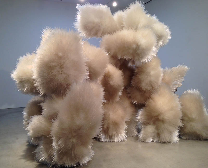 It was a spectacular day this past Saturday here in NYC, ideal for strolling through Chelsea and taking in a lot of art. To my delight most galleries still had great shows up and hadn’t yet reverted to their quieter summer group shows. Over at Pace, the amazing Tara Donovan (previously here) had two new large-scale sculptures. For over a decade, the NYC-born and based Donovan has taken volumes of everyday materials and turned them into impressive works. Whether toothpicks, drinking straws, paper plates, styrofoam cups, or pieces of mylar, Donovan, a MacArthur Genius Award recipient, layers, piles, or clusters these items with a precise repetition until these products assume forms that evoke natural systems. These two sculptures currently at Pace are no exception. The first room in the gallery welcomes you with what seem to be a group of conical rock formations, possibly of a volcanic sort but, upon closer inspection, the millions of 3″ x 5″ index cards stacked and glued become evident, proving, once again, her ability to create amazing effects through the accumulation of identical objects. The second room contains what looks to be an almost fluffy or furry sculpture, but in fact is made of thousands of acrylic rods of different lengths, quite the opposite of soft or fluffy. These “bursts” are interconnected much in the way coral appears to be. Donovan has experimented with these rods before, but this work is her largest of the series. Tara Donovan’s sculptures will be on exhibit at Pace Gallery through June 28, 2014 extended through August 15th!