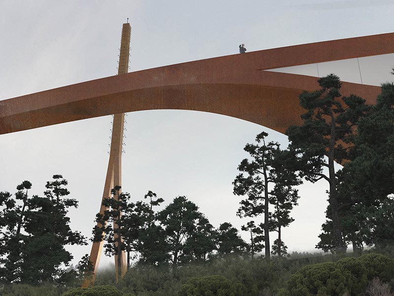 At first glance, the winning design for a 100-meter-tall observation and broadcast tower set to be built in the city of Canakkale—on the northern part of the Aegean coast of Turkey—looks like the latest in cutting edge amusement park rides. Upon a closer look, the strikingly dramatic sweeping structure is a clever solution to the challenges of combining technological requirements of a broadcasting tower with recreational ones of a public space. The two Rotterdam-based architecture firms that formed the winning team, Inter.National.Design (IND) and Powerhouse Company, united all the functions and requirements in a single strong structure. Made of Cor-Ten steel, the looping design offers close-up panoramic views on all sides of both the city and forest as well as a visitor center that hovers above the trees before shooting off into the sky into antenna-mode. A future iconic landmark for sure.