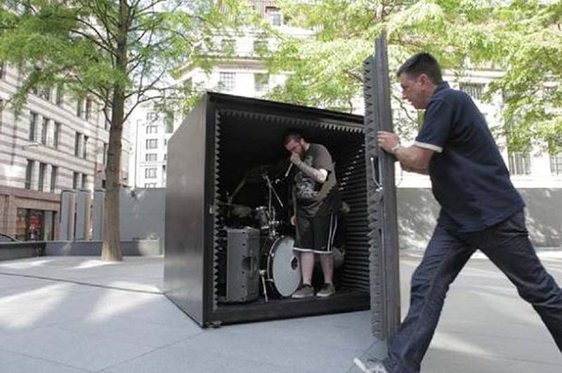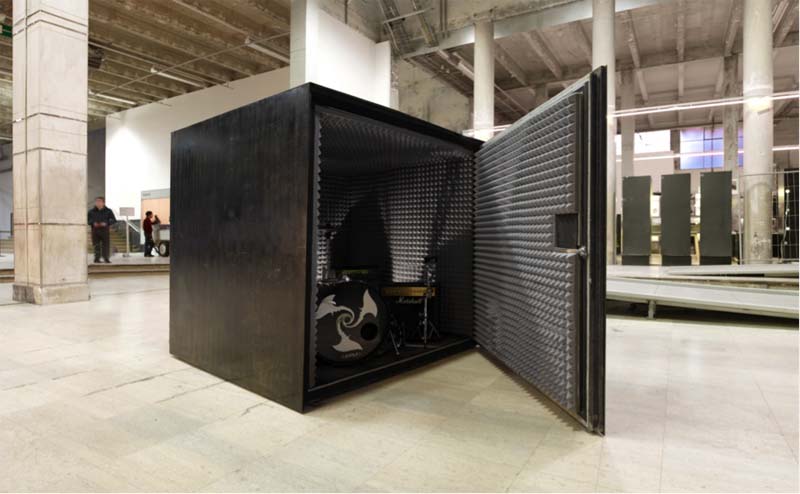 This isn’t the first time artist João Onofre displays his art installation titled Box Sized Die, nor is it likely to be the last. It is, however, the first time the installation has gone to London. Consisting of a large soundproof steel cube, the Portuguese artist invites a local Death Metal band to play inside the cramped space both with the door open, and then with it closed, limiting the performance length to how long the band can last before the oxygen runs out. Placed in the heart of the business district for this summer’s Sculpture in the City festival, Box Sized Die, according to Onofre, is meant to symbolize the office buildings that surround it filled with cubicles and impossible to know what’s going on inside from the exterior. Spectators put their ears to the box to hear the band Unfathomable Ruination play their self-proclaimed “unrelenting brutal death metal” to no avail, but the band seems to be embracing the challenge wholeheartedly having lasted between 19 and 25 minutes in the sealed box so far.