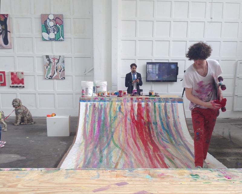 A couple of months back I made the trip out to Mana Contemporary (a surprising cultural hub in Jersey City) and witnessed Matt Reilly of Japanther—a band established by Reilly and Ian Vanek while students at Pratt and described by art reviewers as “art-rock installation paratroopers” —skateboard paint. Somewhere between Jackson Pollock’s drips and Aaron Young’s multi-motorcycle performance art piece Greeting Card, lies Reilly’s skate-painting. By adding paint to the wheels of his board with sponges and then showing off his skating skills, Reilly is able to create large, abstract paintings while putting on a mesmerizing show. The results are nicer than I would have imagined, and the process was fun to watch. You can see him in action below: