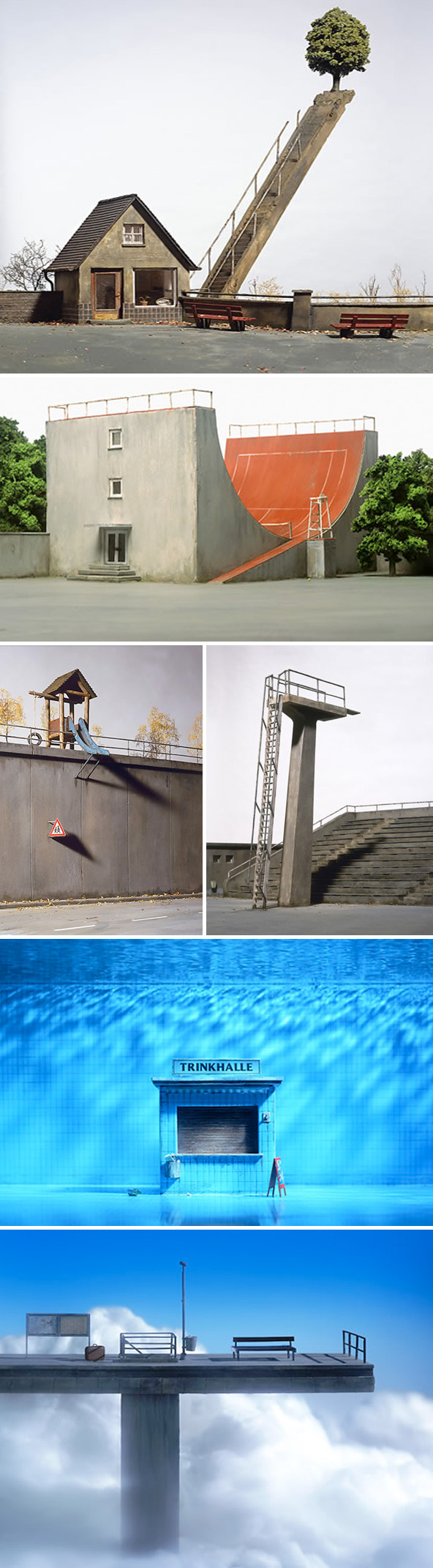 The second work from the top is Pie de Amigo (Foot of Friend) is an arc of stacked architecture books with one pencil placed in the leaves of each book that, if removed, would cause the whole piece to tumble.