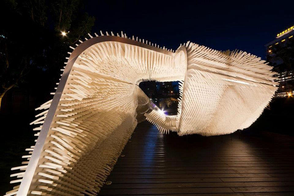 Now, back to the exhibit: Amazing. The bright white light installation is the closest thing to what, I imagine, standing in a cloud might feel like. The first impression is that of a flat wall created by light. As one reluctantly steps forward—wearing the white booties provided by the gallery to keep things pristine—it feels as though you’re stepping into the void. The minute the light box is entered, all depth perception disappears. There’s a dense fog-like effect that’s created with light and white paint. The walls have been curved and the lack of hard lines or horizon intensifies the confusing sensation. The result is at first a little unsettling, but the incredible coolness instantly follows. The light in the box fluctuates emulating the light of day, from dawn to dusk, in a 32-minute loop.