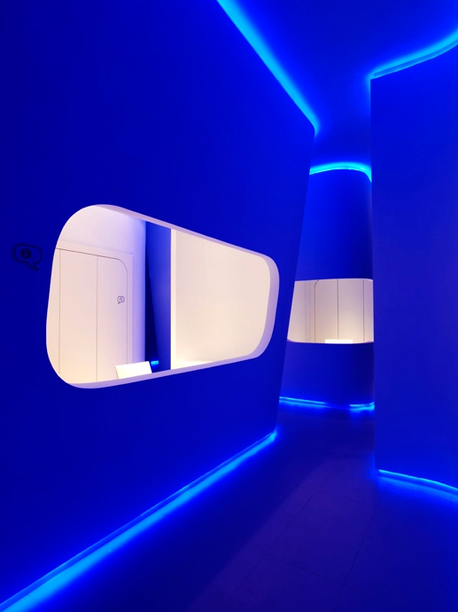 Spanish architects Cuarto Pensante like to say (at least on their website) that they are “creators of spaces and emotions.” Seems to be especially true in their design for the offices of Hidrosalud, a water treatment company in Spain. Everything about the space, from the white walls tinted blue by the winding recessed lights, to the shapes and curves of the walls, has a very flow-y, water-like feel. In addition, some of the glass walls/windows utilize an Xray lighting system that, when off, allows the glass to be transparent and, when the electric current is on, makes the glass opaque. (Very Bar89-bathroom.)