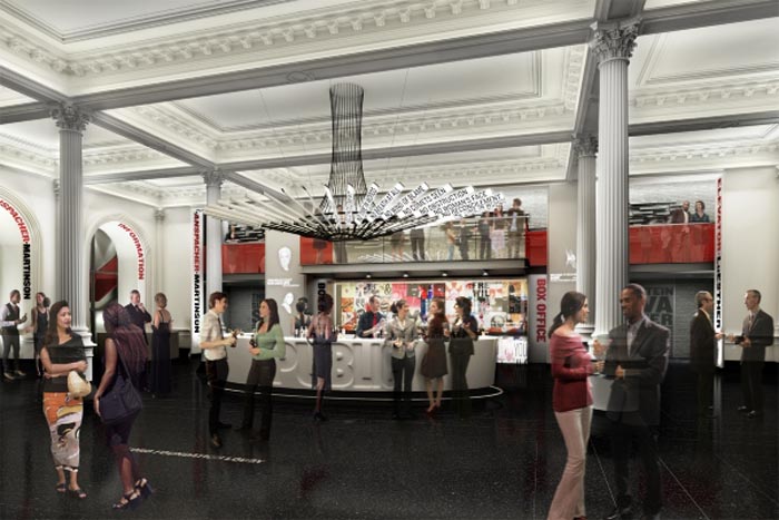 A large-scale multimedia sculpture, “Shakespeare Machine,” has been commissioned from Ben Rubin for The Public’s lobby. Suspended from the ceiling and serving as the lobby’s chandelier, the work features 37 display screens on which fragments of Shakespeare’s plays appear and dance, creating an unfolding kaleidoscope of language in motion. The installation is part of New York City’s Percent for Art initiative, which ensures that a portion of construction project budgets are dedicated to site-specific artworks.