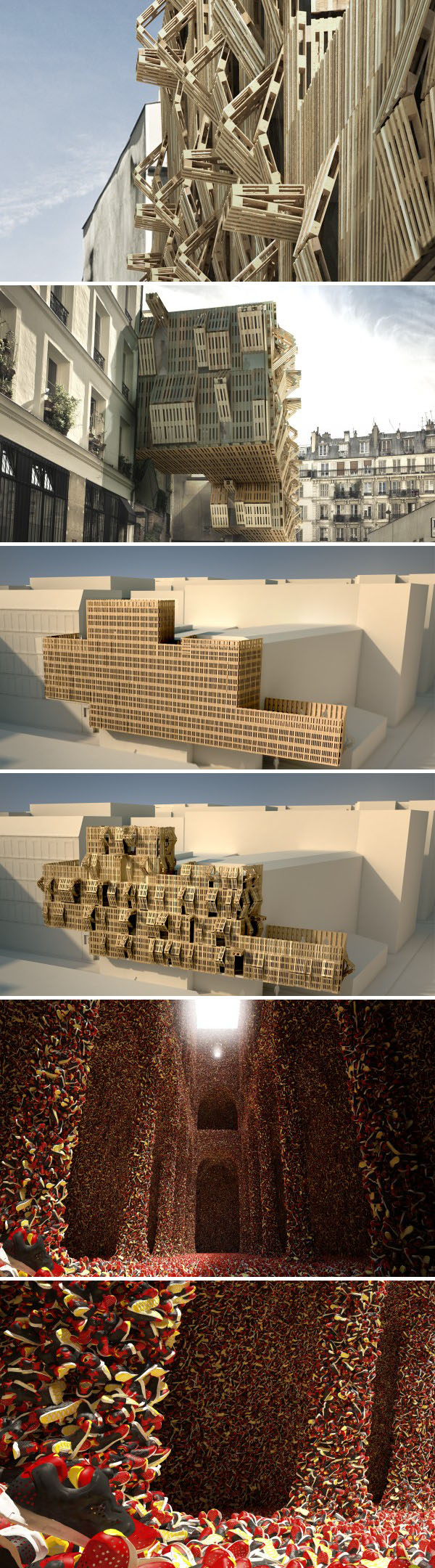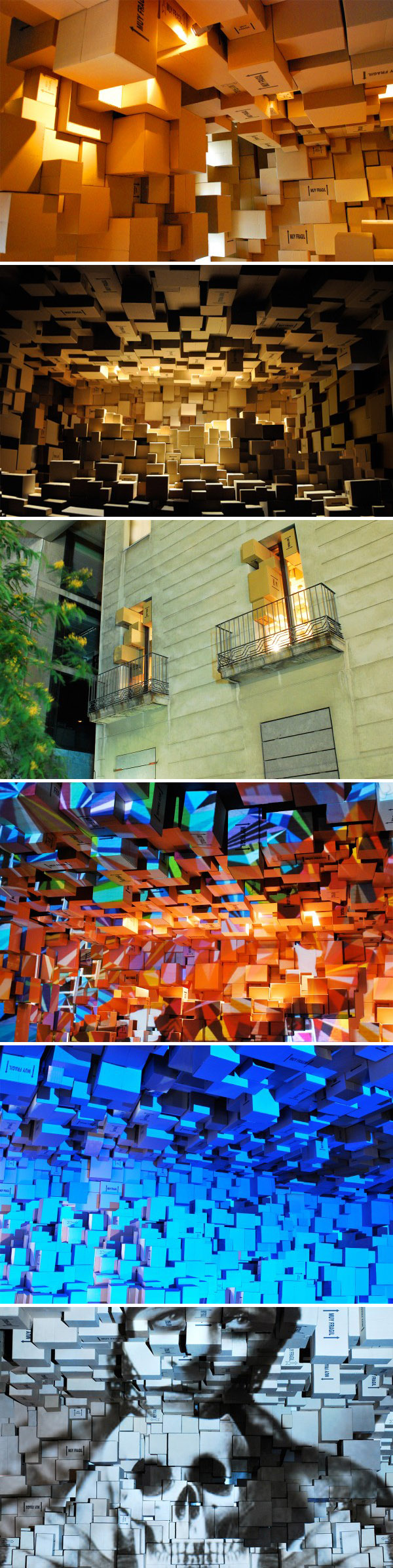 From top to bottom: Boombox Space Invader, Moscow; Boombox-luz, Barcelona (with light projections); Ame-Lot On the Blind Walls, Paris (a study on housing and avoidance of deconstruction but rather superimposing interventions onto built buildings.);  The Temple of Fury for NYC, a study for an installation made of Reebok Fury Insta-Pumps. A criticism of today’s excessive consumption and desire over need.